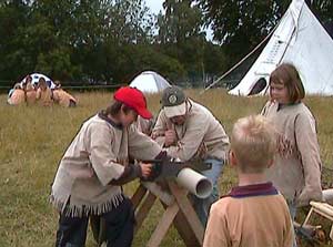 unseres Indianerdorfes. Dort sitzen wir am Feuer,